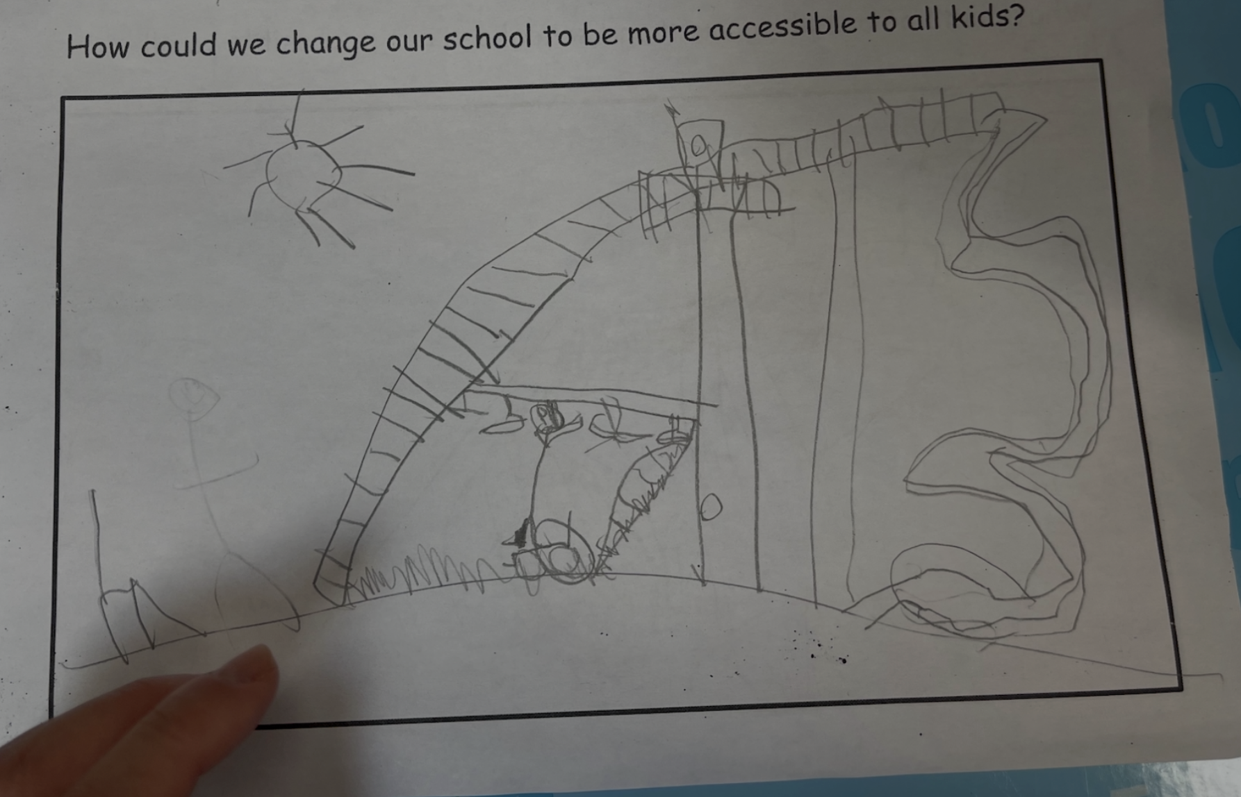 Building on what they learned in this unit, students also identified parts of the school playground that were not accessible to all kids and suggested designs that can be more accessible to all. The photos below show a student’s designs that reflected their evolving ideas of disabilities and accessibility and their agency in making changes for more inclusive and equitable participation.